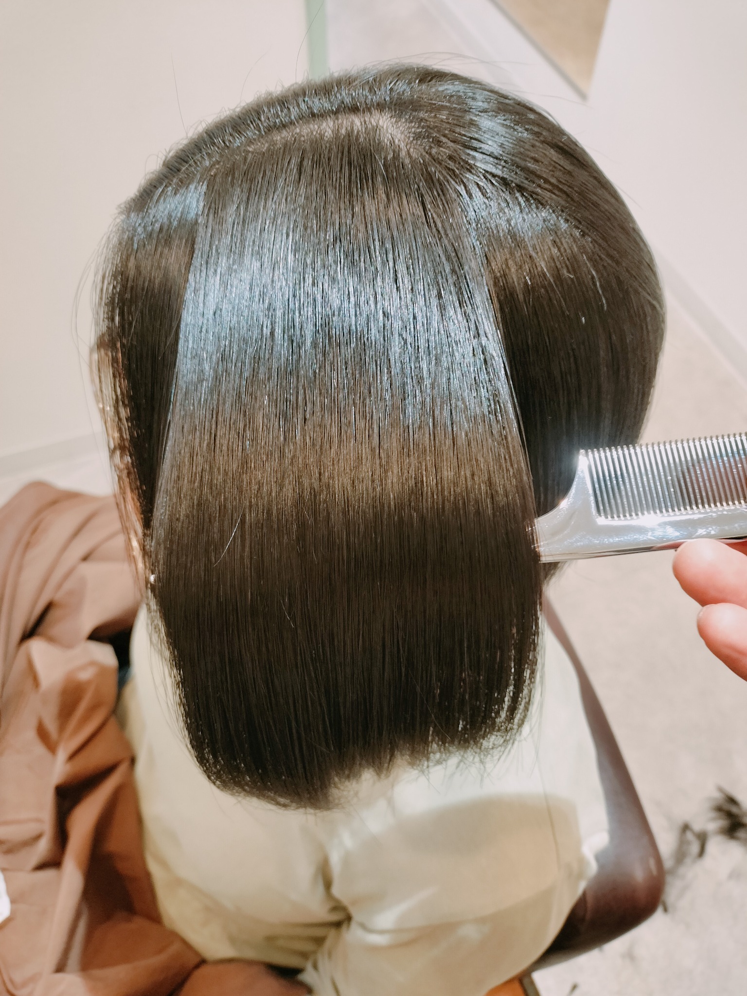 縮毛矯正は「真っ直ぐにする」のが目的ではなく、自然な丸みとツヤ感を出すよう薬剤・熱をコントロール。