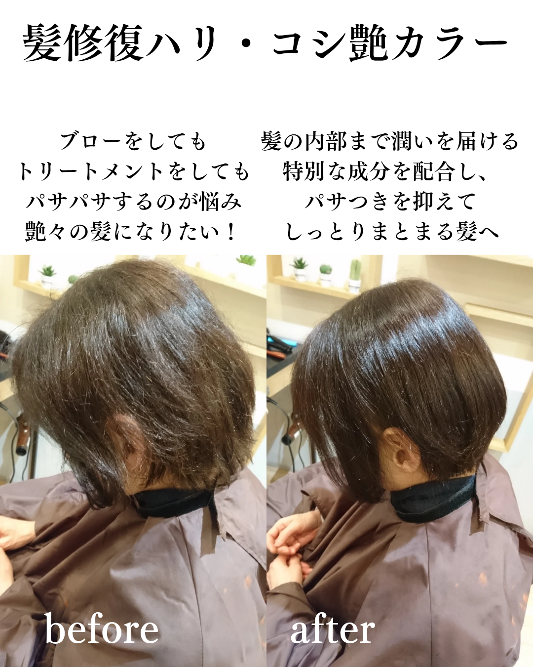 当店で人気No.1メニューの髪修復ハリ・コシ艶カラーは、 ● 髪に潤いを与える艶成分 ● ハリ・コシを出す特殊な調合 を施したオーダーメイド処方。 カラーしながら髪を補修し、ハリ・コシ・ツヤのある仕上がりに。お客様も 「うれしくて出かけたくなっちゃった!」 と素敵な笑顔でお帰りになりました😊
