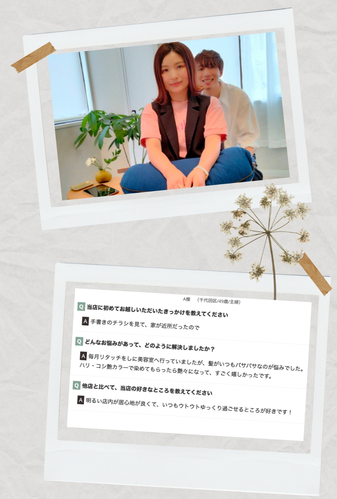 「染めてもらったら髪に弾力が戻って、毎朝のセットがラクになりました!お店も明るくて居心地がよく、つい長居してしまうんです(笑)」