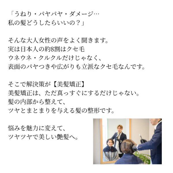 年齢とともに感じるハリコシ低下や艶不足は、うねりやパヤつきと同時進行しがちです。美髪矯正は艶・まとまり・やわらかさを同時に高められるため、白髪染めをされる方やエイジング毛の方にもおすすめ。見た目の若々しさと日々の扱いやすさが両立します。