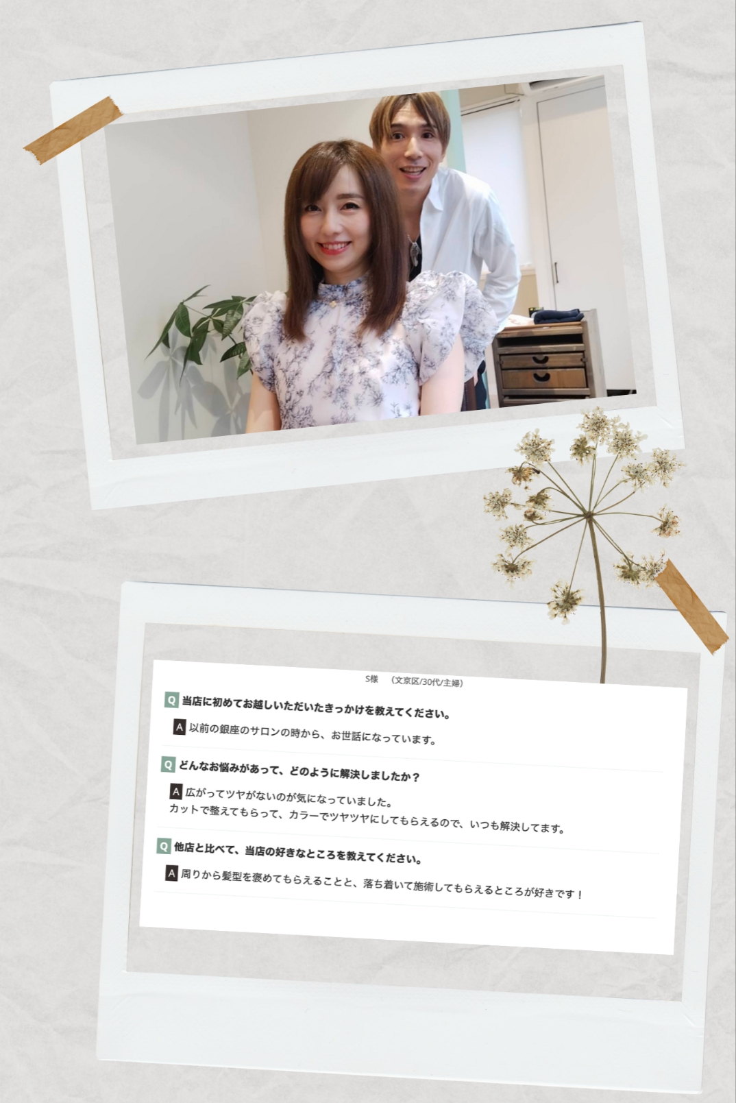 「周りから髪型を褒めてもらえることと、落ち着いて施術してもらえるところが好きです!」
