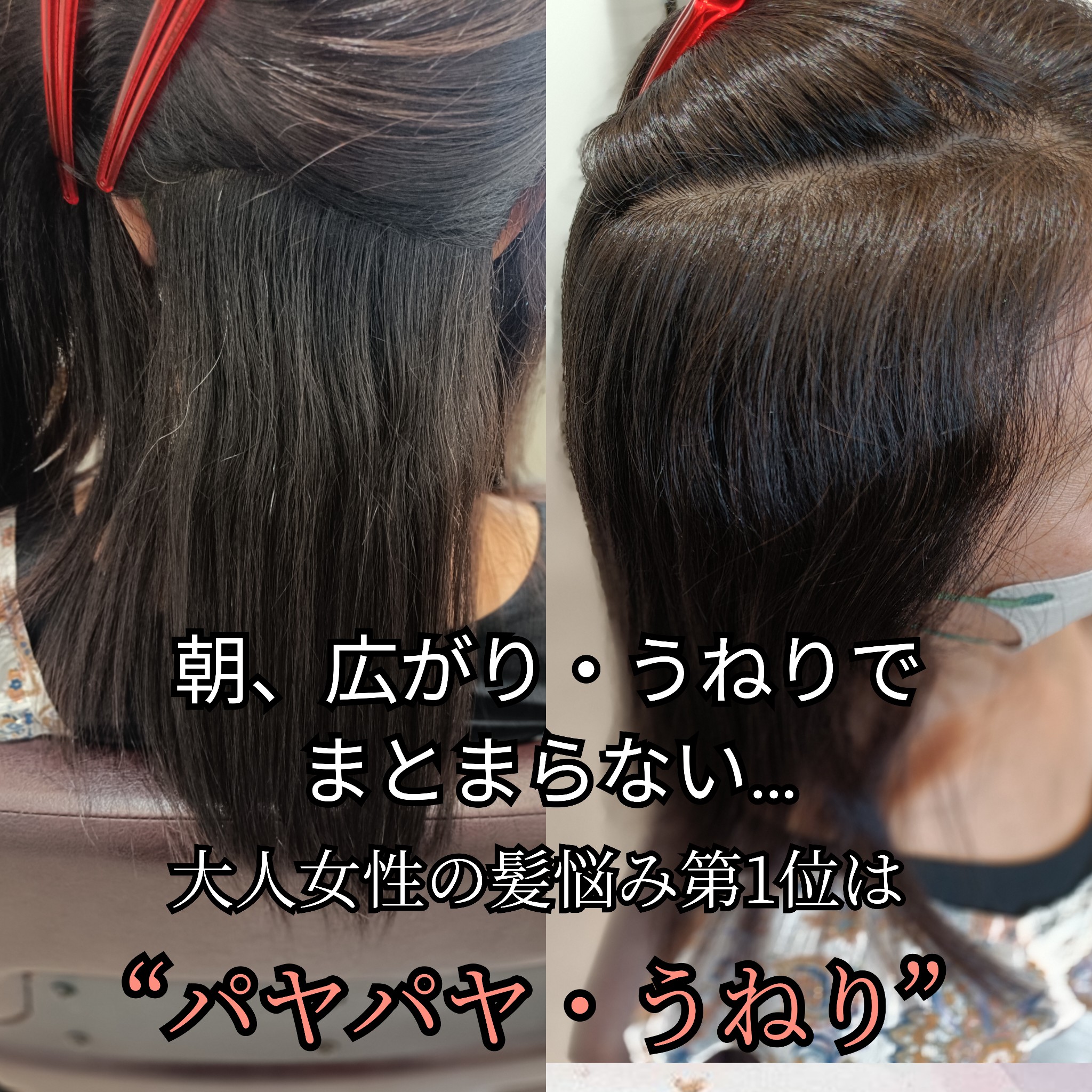 特に「朝、広がってまとまらない」「パヤパヤと浮き毛が出る」「うねりで老けて見える」というお悩みは、大人女性にとって深刻です。