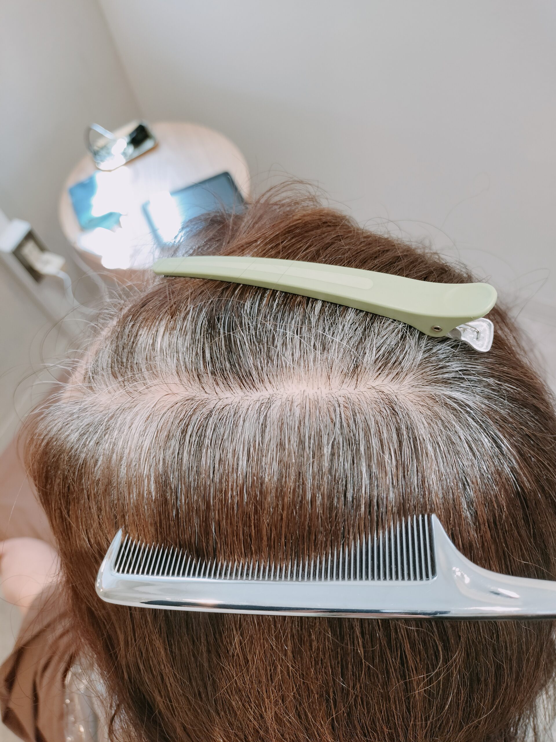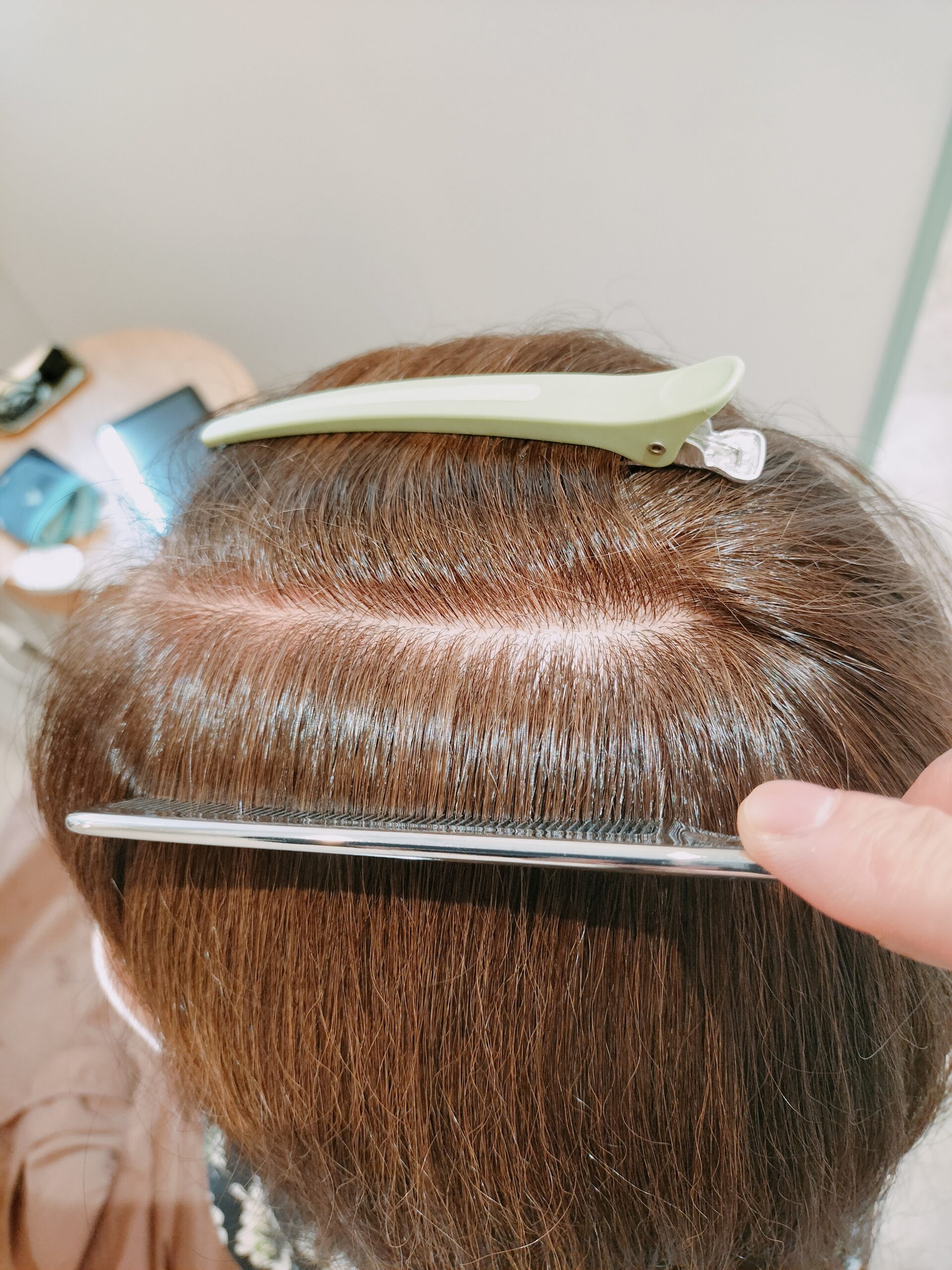 今回の施術では、黒髪を明るくしながら白髪もキレイに染まるという、ちょっと特殊な薬剤配合を使いました。
