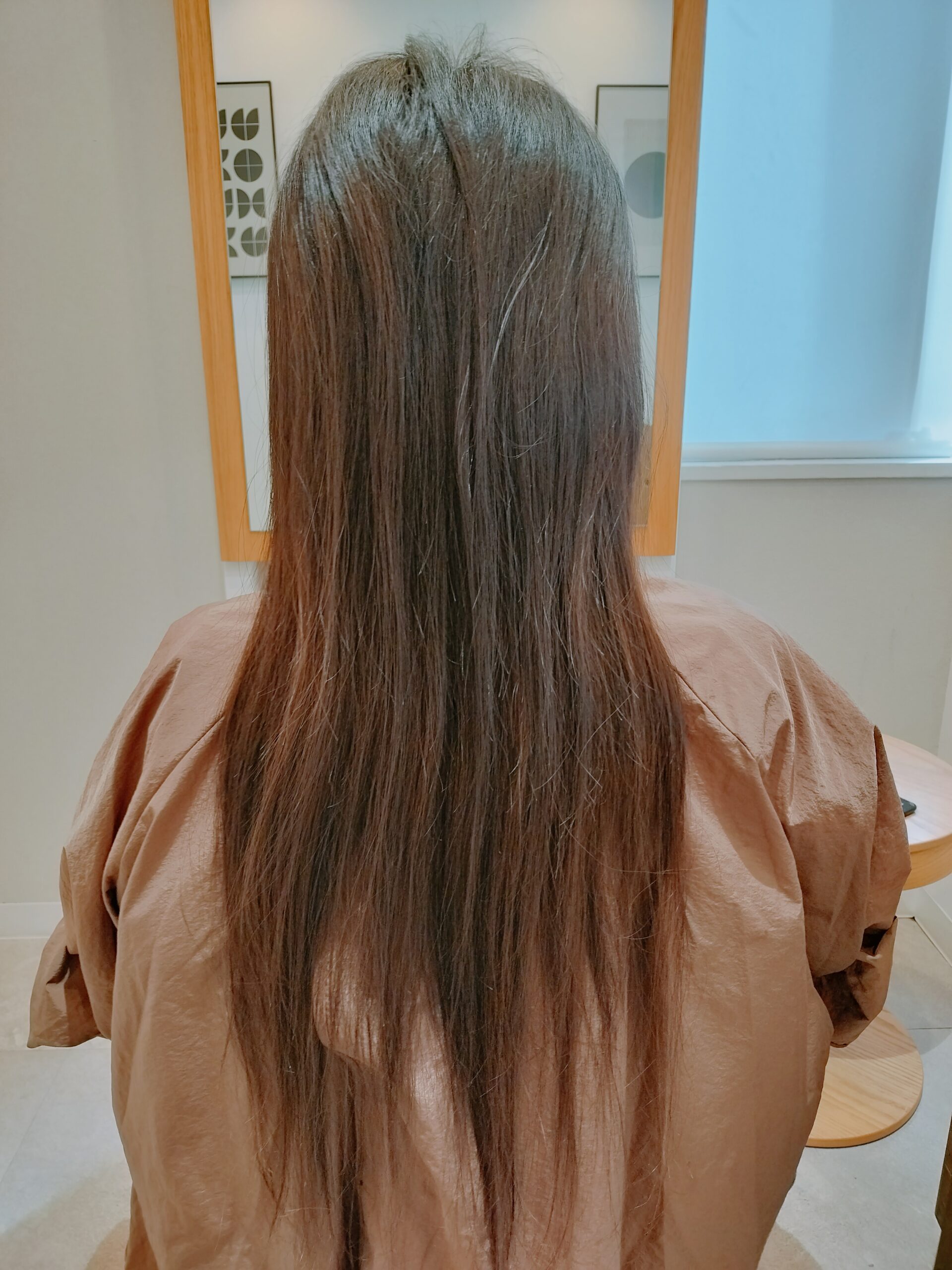 今回は、根元だけのリタッチも検討しましたが、毛先のヨレ・短い髪の影響でまとまりにくくなっていたため、毛先まで美髪矯正を施術しました。